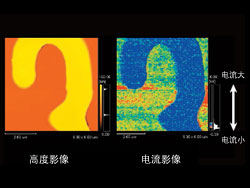 | ![]() Si電路板上的SiO2圖案樣品。高度影像(左)中 顯示為黃色的部分是SiO2。在電流影像(右)中 顯示為藍(lán)色(電流不經(jīng)過的部分)。通過上圖, 可以明確電路板中也存在電流不經(jīng)過的部分。 |