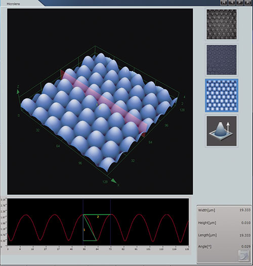 高度測量(微透鏡) | 激光顯微鏡采用短波長半導(dǎo)體激光和獨有的雙共焦光學(xué)系統(tǒng), 會刪除未聚焦區(qū)域的信號, 只將聚焦范圍內(nèi)的反射光檢測為同一高度。同時結(jié)合高精度的光柵讀取能力, 可以生成高畫質(zhì)的影像, 實現(xiàn)精確的3D測量。 |