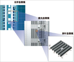 激光顯微鏡的高精度XY掃描(示例) | 光學(xué)顯微鏡的平面分辨率很大程度上取決于所用光的光子和波長,采用短波長的激光掃描顯微鏡(LSM)比采用可見光的傳統(tǒng)顯微鏡,擁 有更高的平面分辨率。 LEXT OLS4500采用405 nm的短波長半導(dǎo)體激光、高數(shù)值孔徑的專用物鏡、以及獨特的共焦光學(xué)系統(tǒng),可以達(dá)到0.12 μm的平面分辨率。此外,OLS4500配有奧林巴斯獨有的掃描加掃描型2D掃描儀,可以實現(xiàn)高達(dá)4096×4096像素的高精度XY掃描。 |